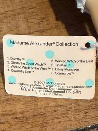 Lot Of 5 McDonald’s 2007 Happy Meal “Wizard Of Oz” Madame Alexander Dolls. 1) Wicked Witch Of The East 2) Cowardly Lion 3) Daisy Munchkin 4) Dorothy 5) Tin Man. All are in like new condition with tags and are from a pet and smoke free home. $50 for a lot of 5. Cash only. No Venmo or other form of payment. FCFS with no holds or delivery. Porch pick up in Sherman Illinois.