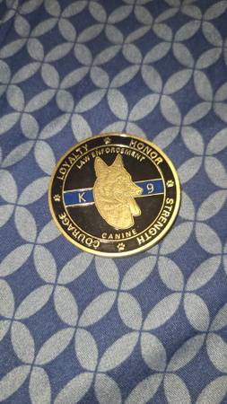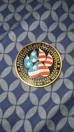 K-9 coin lovalty honor strength courage back side has red white and blue paw print and says protector of law enforcement guardians of the night $25.00