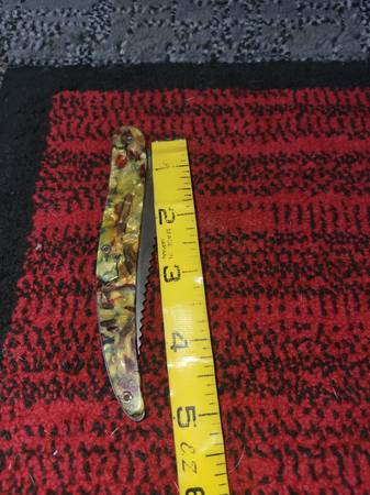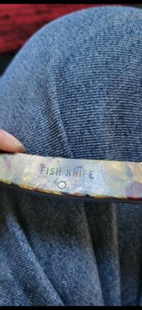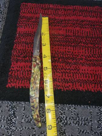 Camouflage knife it says fish knife on the handle see pics VTG COLONIAL pocket knife Craigslist chat is safe. Ur anonymous the chat makes up initials for ya to use see pics messages appear on the...