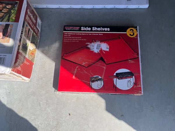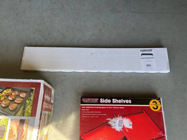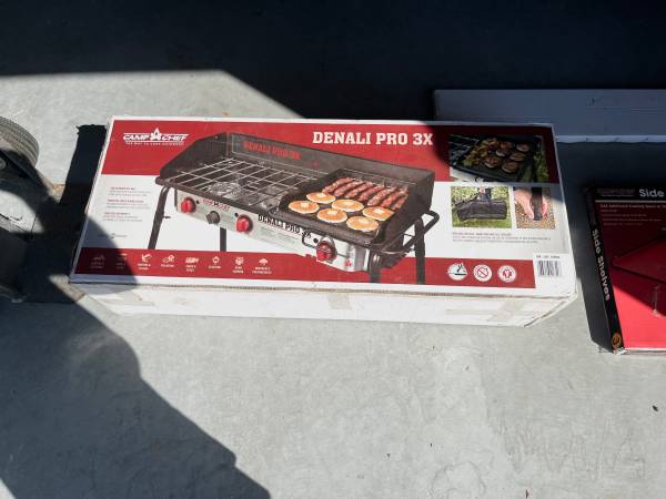 Camp Chef 3 burner gas grill (Denali Pro 3X) BRAND NEW in unopened box. Also have optional side shelves (new in box), and optional wind screen (new in box). $200 takes it all. Call/Text Jim @...