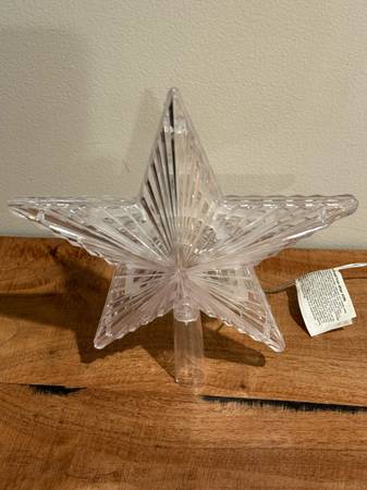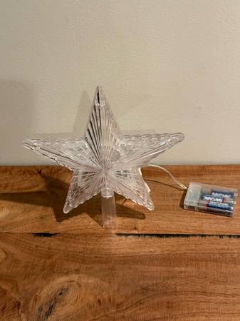 Illuminate your Christmas tree this year with this Colorful Star Christmas Tree Topper. This 5 point LED color changing plastic star is 9.5” T x 8.75” W and is double sided for visibility from all angles with super bright bulbs. It is battery operated and requires 3 “AA” batteries NOT included! The lights change colors and flash. Like new condition and from a pet and smoke free home. $15 cash only. No Venmo or other form of payment. FCFS with no holds or delivery. Porch pick up in Sherman Illinois.