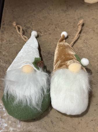 Lot of 4 velvet gnome ornaments and 1 large Khaki cross ornament. The gnomes and cross are all 7” tall. They are new and from a pet and smoke free home. Selling as a group of 5 for one price. $5 cash only. No Venmo or other form of payment. FCFS with no holds or delivery. Porch pick up in Sherman Illinois.