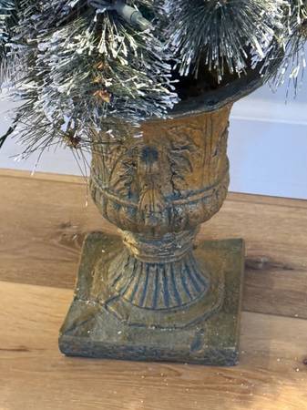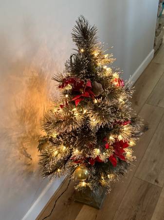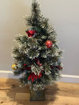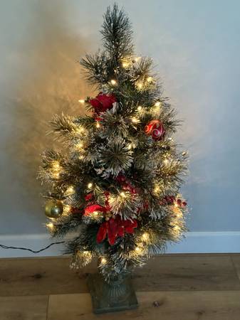 Like new Pre-Lit Flocked Artificial potted Christmas Tree in a decorated cast urn. Measures 3.5 feet tall, is 18” wide, has clear, incandescent lights, is adorned with red poinsettias, red berries, and red and gold round ornaments. Just plug it in to the socket and you have a beautifully decorated tree.$40 cash only. No Venmo or other form of payment. FCFS with no holds or delivery. Porch pick up in Sherman Illinois.