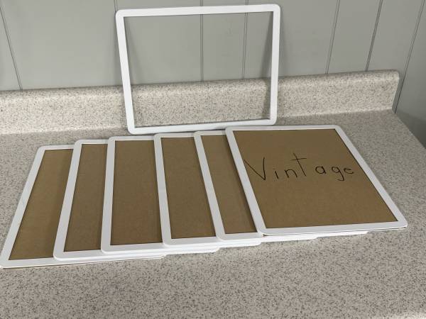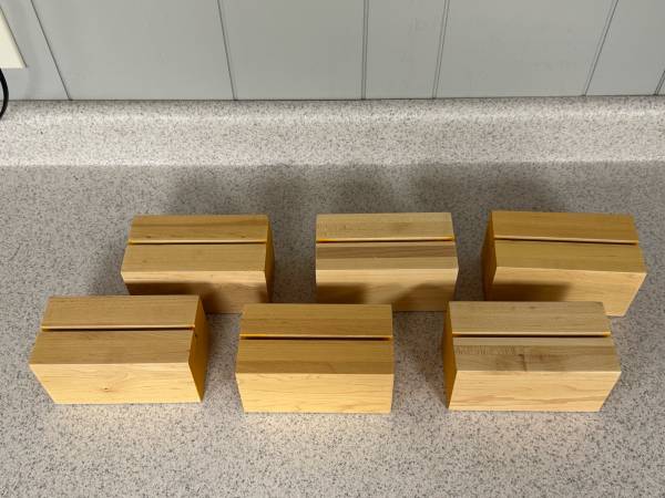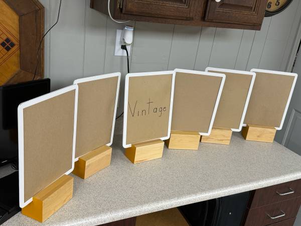 Table Top Wood Display Blocks With Metal Frames. These were used in our business to mark the various items being sold. Simply insert your item Marked names in the metal frame and slide it into the solid wooden block. I also use them by arranging my items on tables and categorizing them by selling amount, item identifier (shirts, sweaters, jeans), colors, and size indicators, a multitude of uses and so easy to use. Each metal pocket frame holds one sign that can have writing on each side. I used cardboard to make the various markers. Slide the metal frame markers into the wood blocks and it will stand up on its own. There are 6 wooden blocks and 7 metal frames. Very pricey to buy these new. My loss is your gain! Only Selling as the lot of 13 pieces total for $30 cash only. No Venmo other form of payment. FCFS with no holds or delivery. Porch pick up in Sherman Illinois Illinois.