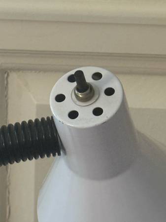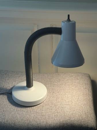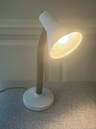 Like New Bendable Desk Lamp. This White Metal desk lamp is 16” tall, has a 5” round base and an on/ off knob on the back of the shade. It works fine (bulb is not included) and is from a pet and smoke free home. $8 cash only. No Venmo or other form of payment. Porch pick up is in Sherman Illinois.
