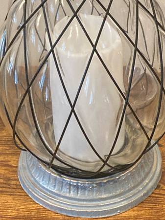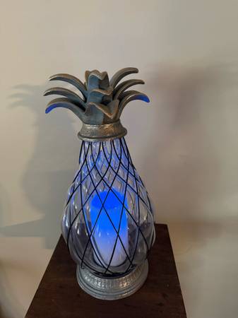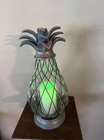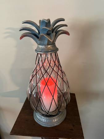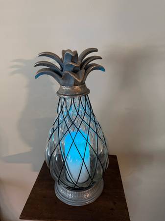 Like New tropical pineapple🍍 lantern with an LED candle that slowly changes colors. This 17” tall lantern has a heavy caged clear glass globe and weather resistant metal. Perfect for your patio, terrace or garden but can also be used indoors. Requires 2 “C” batteries 🪫. BATTERIES NOT INCLUDED!! In excellent working condition and from a pet and smoke free home. $15 Cash Only. No Venmo or other form of payment. FCFS with no holds or delivery. Porch pick up in Sherman, Illinois.