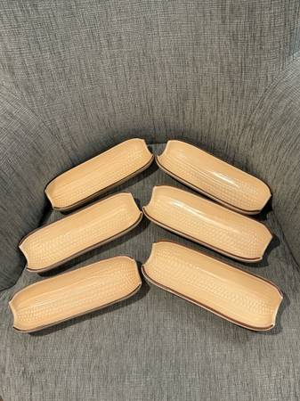 Lot of 7 Vintage Pfaltzgraff #46 ceramic Corn On The Cob ceramic footed Holder Dishes. They Measure 8.5” x 3” x 1.5”, are pale Yellow with Brown trim and the inside looks like corn on the cob. All 7 of them are all in like new condition, clean and from a pet and smoke free home. Lot of 7 for $45 cash only. First come first serve. No Venmo or other form of payment. No holds with porch pick up in Sherman Illinois.