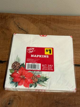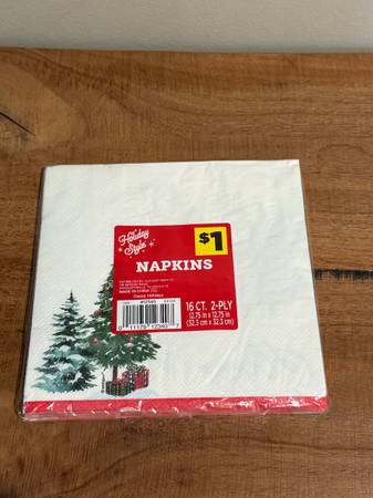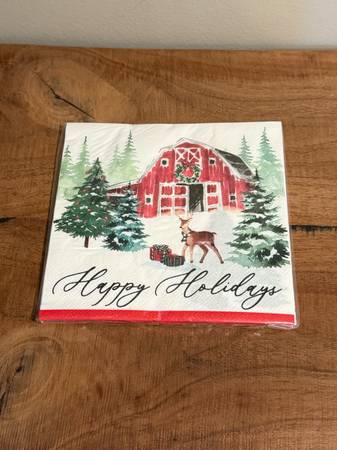 Be ready for your Holiday feast with these New unopened Holiday Napkins. I have 2 different Holiday designs of these 2-ply napkins to choose from. The pictures show the front and back of each choice. They are 12.75” x 12.75” and there are 16 napkins in each package. There are 11 packages of the Red poinsettias with pine cones for $5 or 4 packages of the Happy Holidays Red barn for $2. That’s like .50 each! Please tell me which design you want. FCFS on choice. Cash Only. No Venmo or other form of payment. No holds or delivery. Porch pick up in Sherman Illinois.