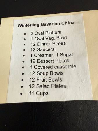 Selling a group of 88 pieces of Winterling Bavarian China. See pictures for list of what pieces are included. All are in great vintage condition, clean and from a pet and smoke free home. $65 cash only. No Venmo or other forms of payment. Cross posted with no holds or delivery. Porch pick up in Sherman Illinois.