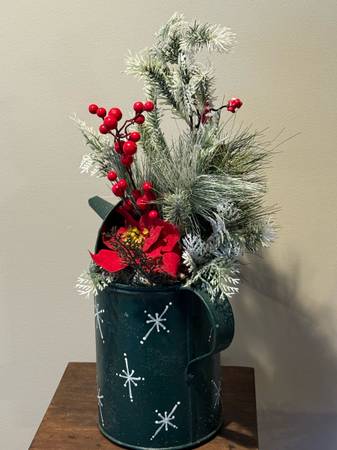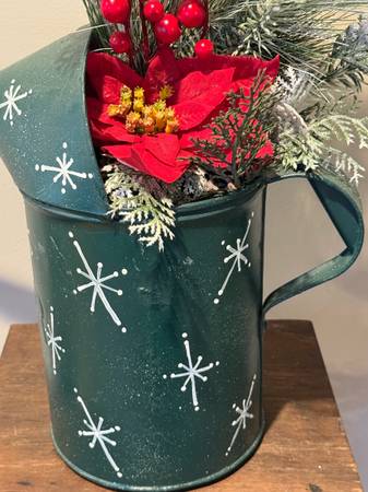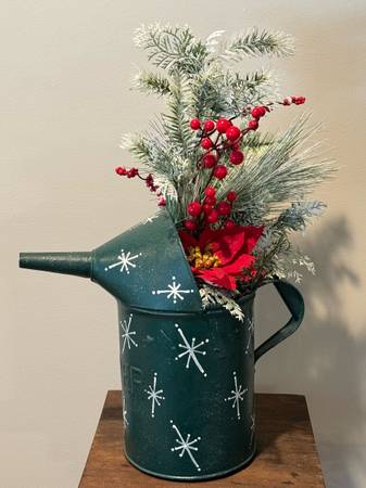 Vintage “Dover” metal Watering Can Christmas Decor. Overall size is 23” T to the top of the greenery x 15” W from the spout across to the handle. It is painted Green, has snowflakes painted on the side, a Red Poinsettia, Red berries and greenery in it. A very unique piece of Holiday decor. Can be used as a Christmas centerpiece or just as room decor. $30 cash only. No Venmo or other form of payment. FCFS with no holds or delivery. Porch pick up in Sherman Illinois.