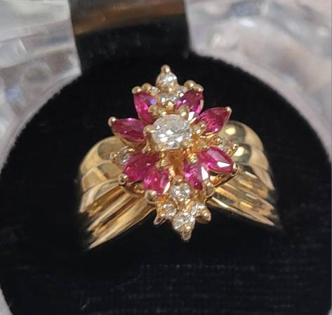 Beautiful Ruby and Diamond ring, 14K yellow gold, wide band. Size 7 or 7 1/2. $875 cash, local pick-up only. Will meet in public place. Have some original paperwork. The price of gold is waaay up!!