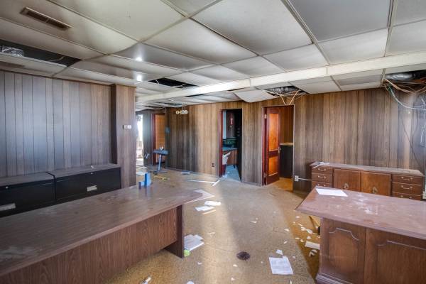The brick portion of the building includes two levels of office and administrative space. The main floor features four private offices, a spacious breakroom or lunchroom with a sink, a storage area, and a men’s restroom equipped with stalls, urinals, and a stainless trough sink. The upper level offers a reception area, seven additional offices, two half bathrooms, a utility area housing two gas furnaces and breaker panels, and a small kitchenette.
