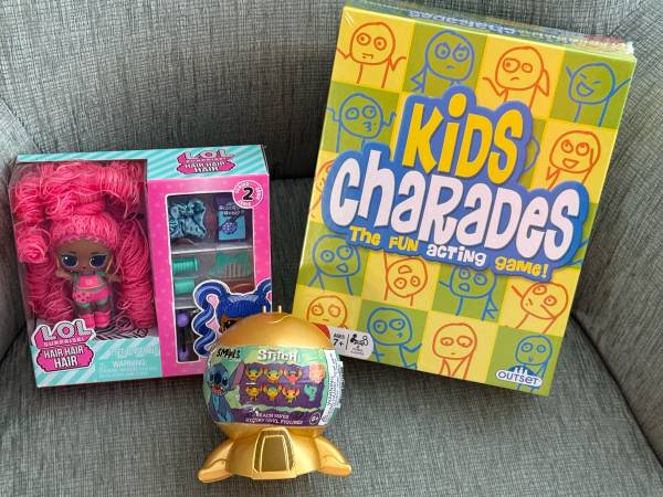 If you are looking for New toys for Christmas presents, here you go! Choice of #1) “Kids Charades” game. New in unopened box, hours of fun for kids ages 7+, #2) LOL Surprise Series 2 Hair Hair Hair set. New in unopened box or #3) Disney “Stitch” mystery Beach Waves vinyl figures. New and unopened. They are From a pet and smoke free. Please tell me your choice when asking about them. Choice at $10 each. No Venmo or other form of payment. FCFS on choice with no holds or delivery. Porch pick up in Sherman Illinois.