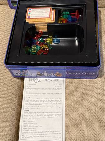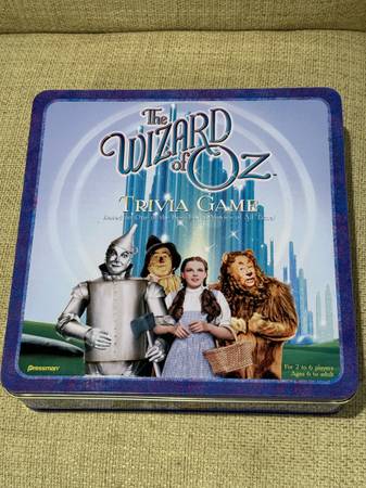 Vintage Like New The Wizard Of Oz Trivia Game in a tin storage container. See how much you about “The Wizard Of Oz” movie with this 1999 board game. It is for 2 to 6 players ages 6 to adult. Includes the game board, 150 trivia cards, 6 emerald city player pieces, rainbow arcs and the game die. Lots of fun for everyone! It s in like new condition and from a pet and smoke free home! $25 cash only. No Venmo or other form of payment. FCFS with no holds or delivery. Porch pick up in Sherman Illinois.