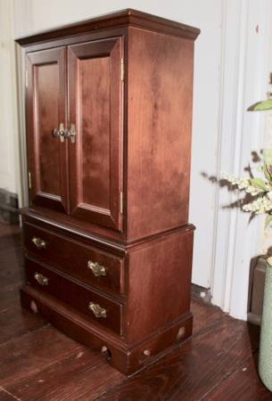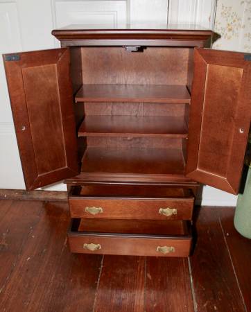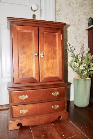 One of my favorite pieces from The Pleasant Company! This beautiful, colonial armoire/wardrobe will transport your doll to another place and time. I played with this as a child but was always very careful, so it's in very good condition (even has the plastic covers on the metal parts) with minor scratches associated with normal wear. It's time to for it to go to a new home for someone else to enjoy as much as I did! There are two shelves inside as well. From a non-smoking home. Don't hesitate to reach out with questions.