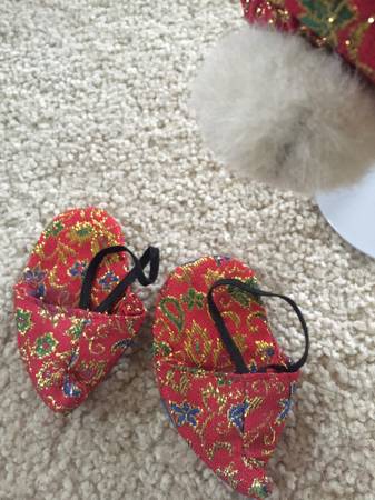 Pieces included: turban with feather, shorts, belly top, slippers.